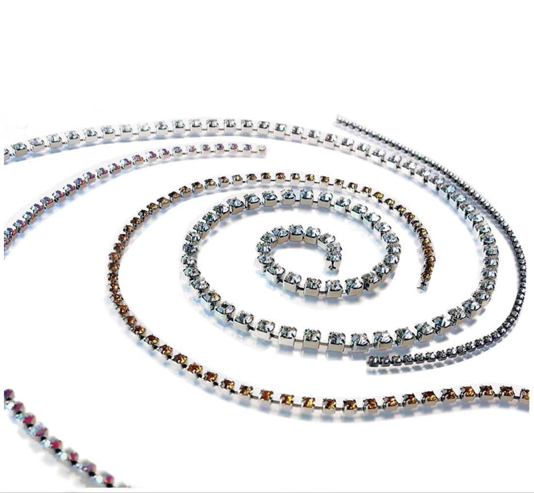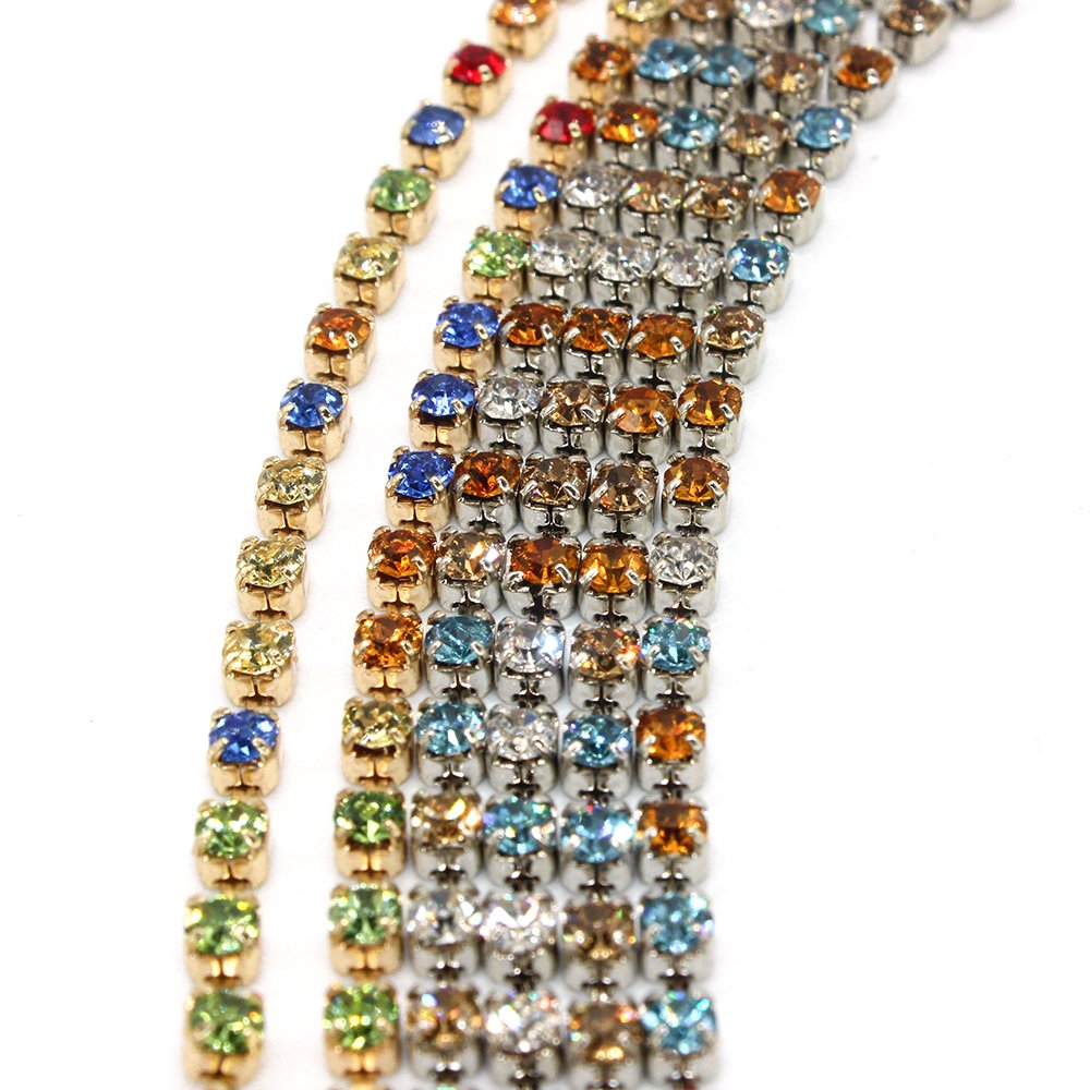 A cup chain strass is a decorative trim made of small, cup-shaped metal settings (usually rhinestones or crystals) linked together in a chain. It is commonly used in fashion design for embellishing garments, shoes, and accessories.